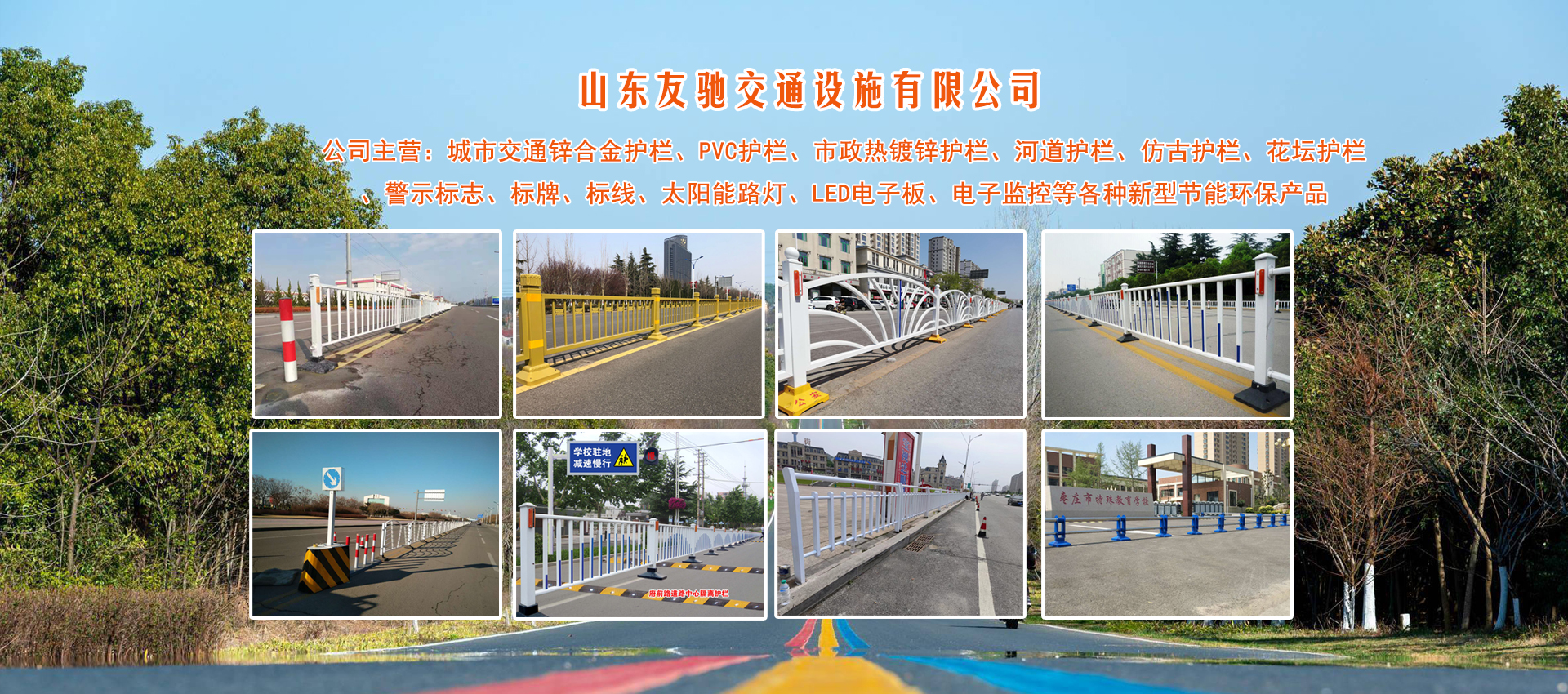 山东友驰交通设施有限公司坐落于古老文化的发源地山东省枣庄市,这里有著名的台儿庄战役、江北水乡运河古城台儿庄,是一座充满活力、独具魅力的新兴旅游城市。既有北方城市的豪放,又兼具江南水乡的秀美,素有“鲁南明珠”之称。地理位置优越交通发达有京杭大运河横贯南北、处于岚曹高速公路及京台高速、京沪高铁贯穿中心。公司主营:城市交通锌合金护栏、PVC护栏、市政热镀锌护栏、河道护栏、仿古护栏、花坛护栏、警示标志、标牌、标线、太阳能路灯、LED电子板、电子监控等各种新型节能环保产品,产品通过国家涂料检测中心认证,并获得了质量、服务、信誉AAA企业认证。公司用户广泛试用,已形成护栏行业品牌、年生产道路护栏200多万米,赢得了用户一致好评。
